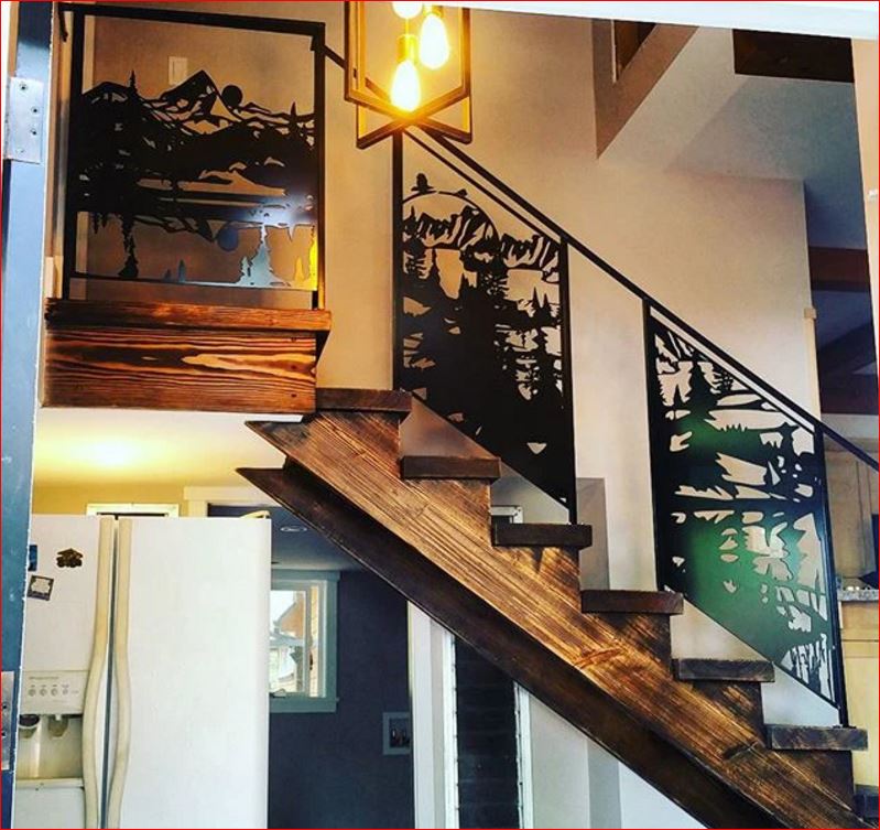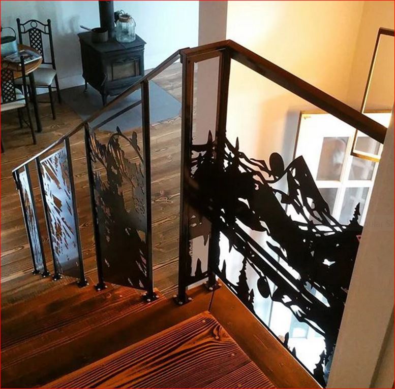 - Custom, metal decor themed stair railings to enhance any cabin or home