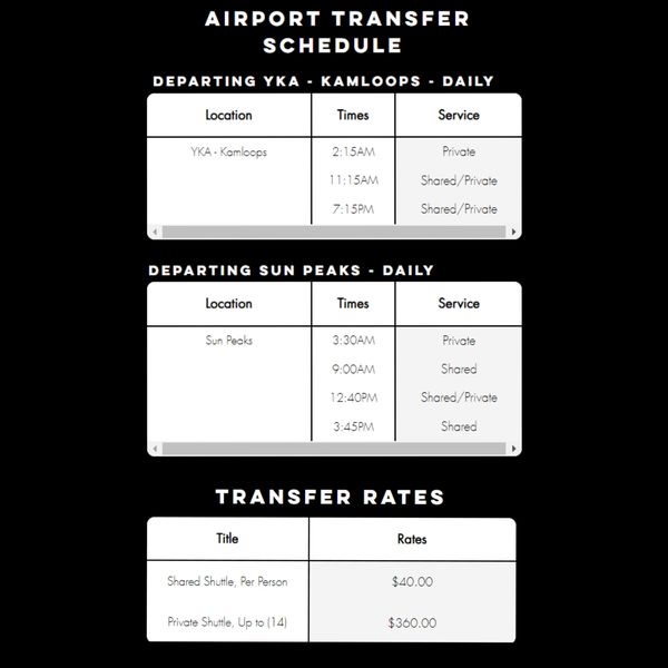 Remember to mention BSPSHARED5 to save $5 per person for shared Kamloops Airport and Inter-Resort Transfers, or BSPPRIVATE50 to get $50/off private Kamloops Airport and Inter Resort Transfers.